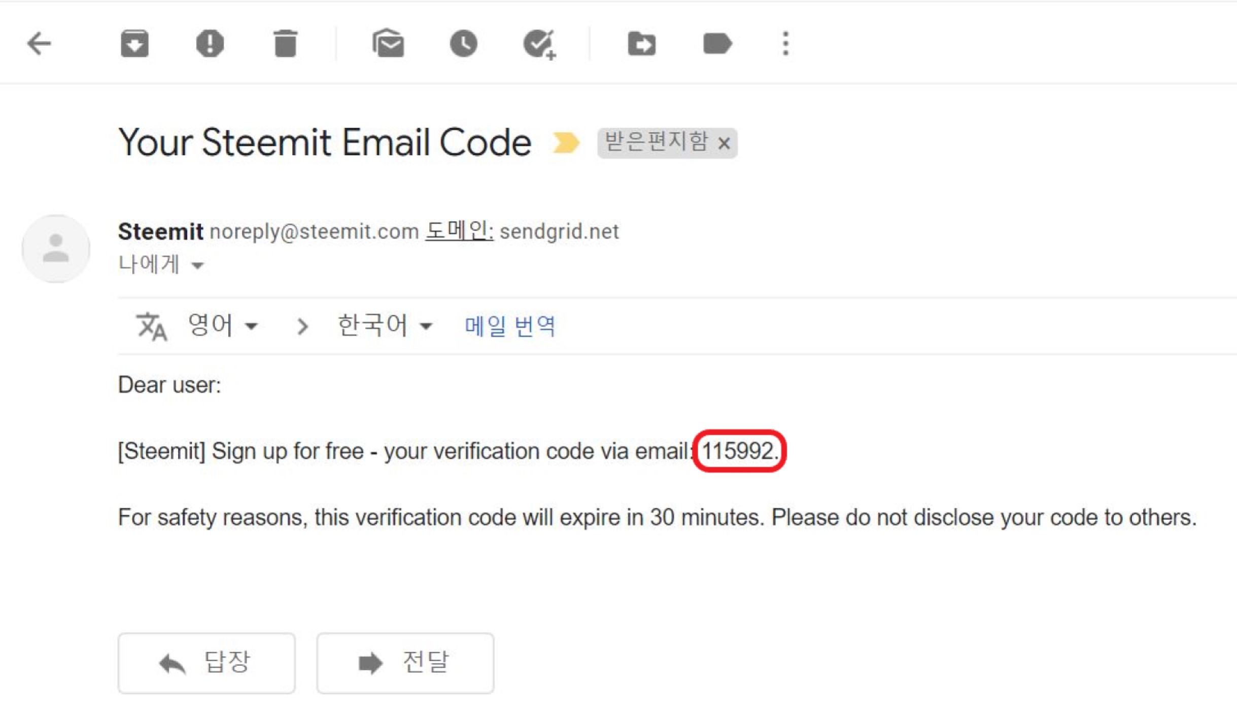 참고로 위에서 이메일을 입력하고 Send code를 누르면 아래와 같이 이메일이 도착하는데 그중에서 붉은 사각형을 해 놓은 곳이 숫자코드이므로 이 숫자를 입력해야 한다.