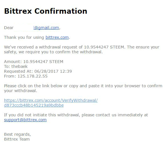 아래의 이메일을 bittrex로부터 받게 되면 링크된 주소로 이동하여 썩세스 합니다. 기분이 꽤 썩세스 한데 스티밋에 제대로 들어오는지를 확인해야겠죠