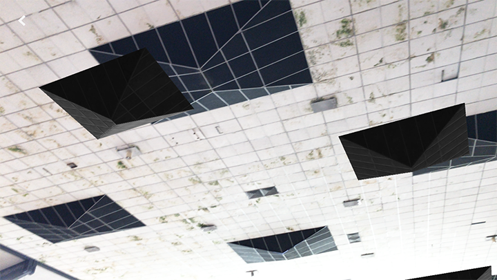 증강현실 앱으로 바라본 천정의 캡쳐화면. 실제 천정구조물 위에 가상의 천정이 겹쳐져 보인다.