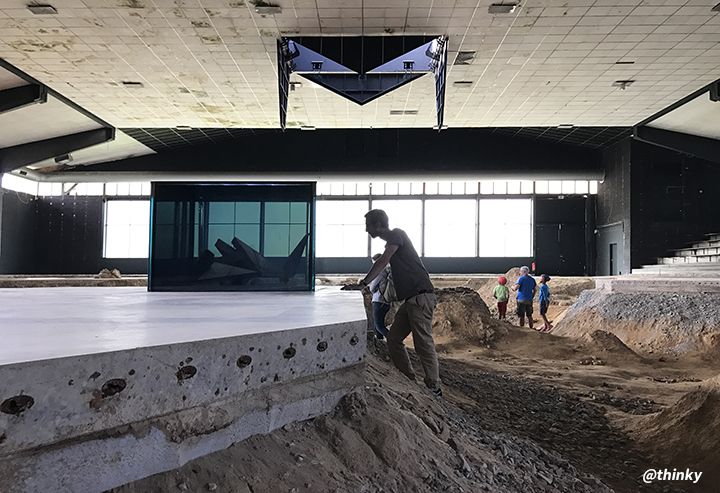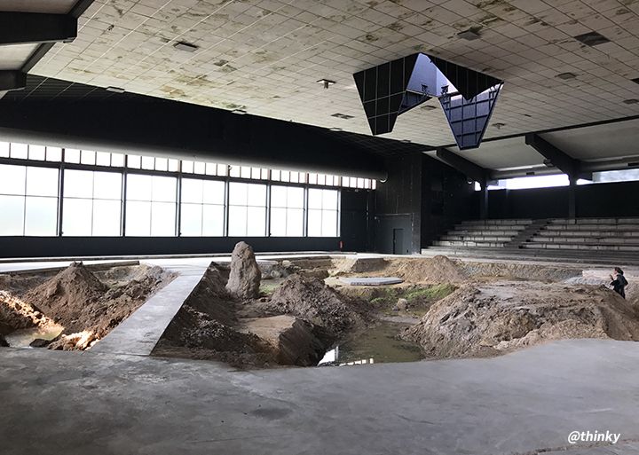 이 작품은 문을 닫은 뮌스터 아이스링크에서 시행되었습니다. 철거가 예정된 아이스링크의 콘크리트 바닥을 의도된 형태로 절단하고 파내어 바닥에는 진흙으로 된 생태 환경을 조성한 다음, 천정에는 일정한 간격으로 열렸다 닫히는 자동문(얼핏 보면 로보트 태권V라도 튀어 나갈 수 있을법한)을 설치하여 햇빛이나 비, 바람 등의 자연 현상을 작품에 반영되도록 하였습니다. 처음에는 어땠을지 짐작은 할 수 있었지만 저희가 관람할 당시에는 시간이 지나며 그러한 자연현상들이 발화하여 군데군데 물 웅덩이가 형성되어 있었고, 자연적 생태 현상으로 새, 박테리아, 벌집, 이끼 등이 서식하고 있었습니다. 철거될 아이스링크라는 상징적 건축물 내부에 관람객이 경험할 수 있는 인위적으로 생성한 생태적 자연환경을 융합시킨 작품입니다.