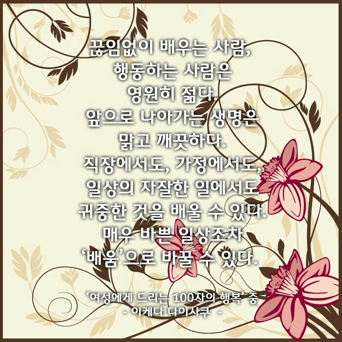 끊임없이 배우는 사람tiaozhan (33)in #kr • 5 years ago (edited) 살면서 여러 부류의 사람을 만나지만 저 사람처럼 되고 싶다, 저런 면은 나도 닮고 싶다는 사람을 만났을 때 삶은 생기 넘치고 활력이 솟는다. 퍼내어도 퍼내어도 마르지 않는 샘물처럼 생기가 넘치는 사람은 끊임없이 배우는 사람이라 생각한다. #krsuccess #learn