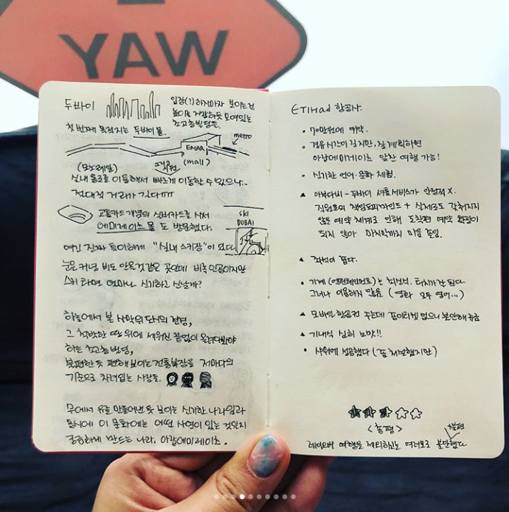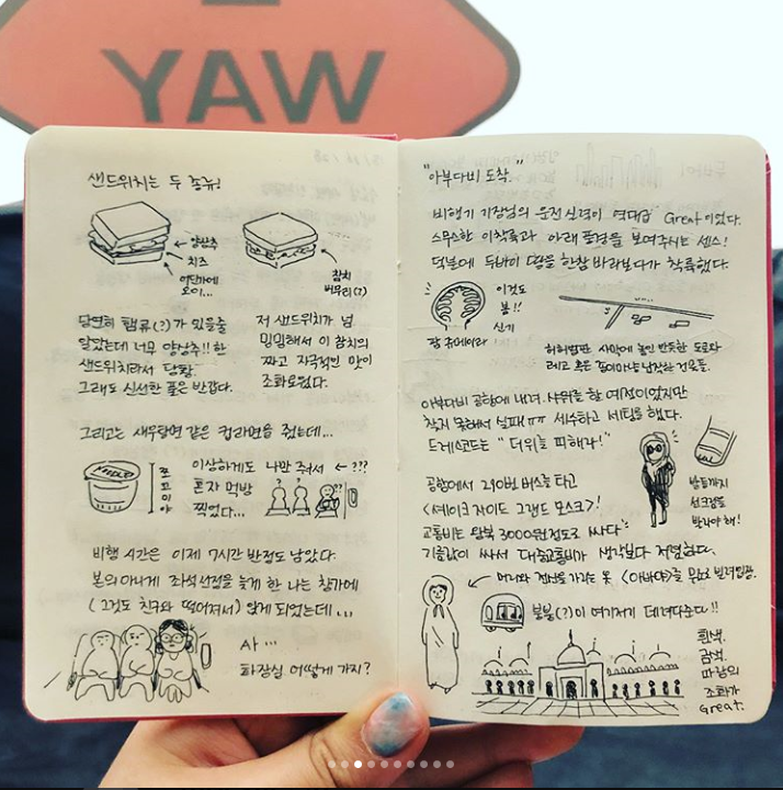 앞으로 일기는 이렇게 오늘의 복장을 보여드리고, 열심히 쓰고 있는 손그림 여행일기를 공유하는 방식이 될 것 같아요😊 매일 그림일기를 그릴 수 없는 건 아쉽지만, 그래도 돌아온 뒤 책을 엮어낼 예정이니 조금 다행이에요!