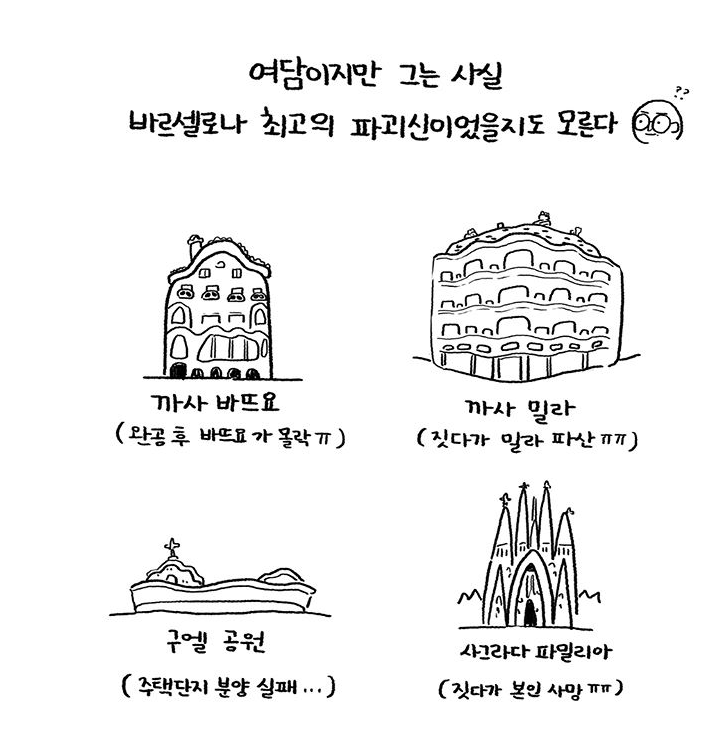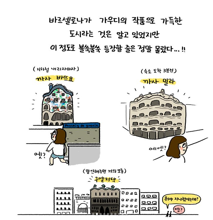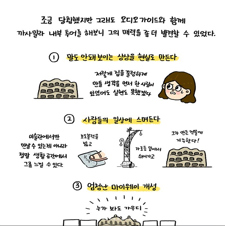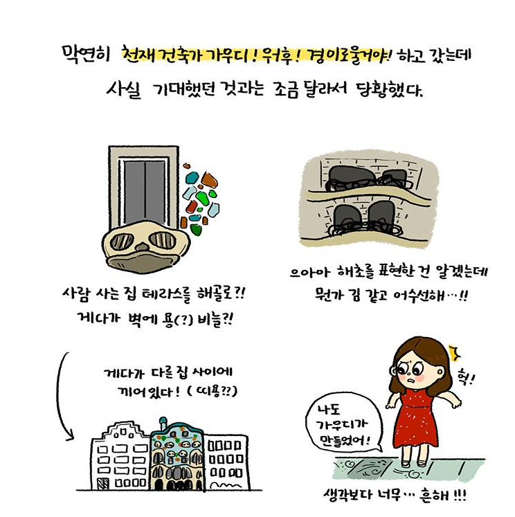 그래서인지 사실은 처음부터 조금 실망해버렸어요. 뭔가 더! 웅장하고 대단할 줄 알았는데!😨 뭐, 사실은 그것조차도 내가 마음대로 상상했던 모습이었던 거죠. 조금 지내다보니 오히려 아무렇지도 않게 만나는 그의 작품들과 정이 들어버렸어요. 교과서에서나 볼 수 있던 까사밀라는 숙소 앞을 지나다니며 무슨 동네 상가처럼 익숙해져버렸어요!😆 이게 뭐람~