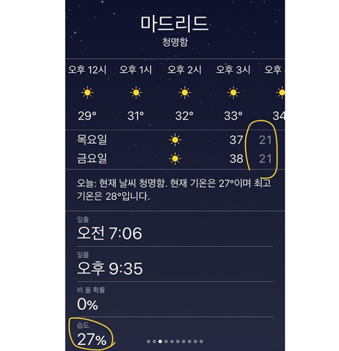 우선 해는 정말정말 뜨겁지만 습도가 낮고 일교차가 커서 밤이 되면 좀 쌀쌀하다 싶을 정도에요! 세상에서 한국이 제일 더운 것 같아요...😭 포르투보다 마드리드가 더 더워서 헉하면서도 한국은 이것보다 더 더울텐데 하면서 걱정하고 있어요ㅋㅋㅋ