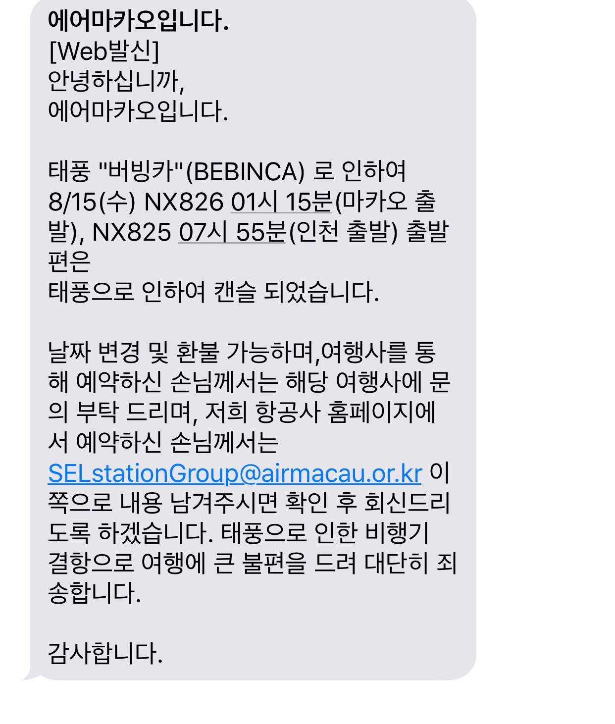 마카오 호텔에 전화해서 호텔도 취소해야하고 비행기도 공연도~