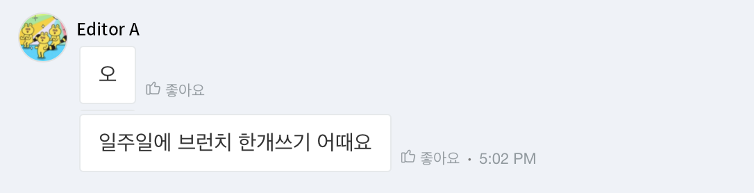 그렇다고 포기를 할 수는 없었다. 내가 꿈꾸고자 하는 언젠가의 출간을 위해서는 글을 잘 쓰지 않는 습관을 고칠 필요가 있기에, 어떻게 할까 고민을 하던 와중에 회사의 Editor A와 글과 관련된 이야기를 했다. 마침 둘 다 브런치를 운영하고 있고 브런치에 대해서 공감대가 오가던 와중에 1주 1 글쓰기에 대한 제안을 받았다.