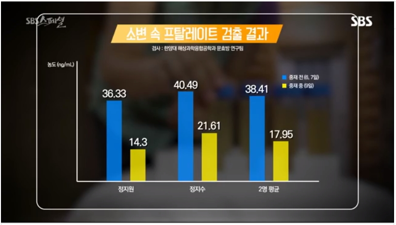 아래는 방송 중 한 가정에서 초등학생 두 자매에 대해 3일간 플라스틱 사용을 절제한 비교 결과인데요