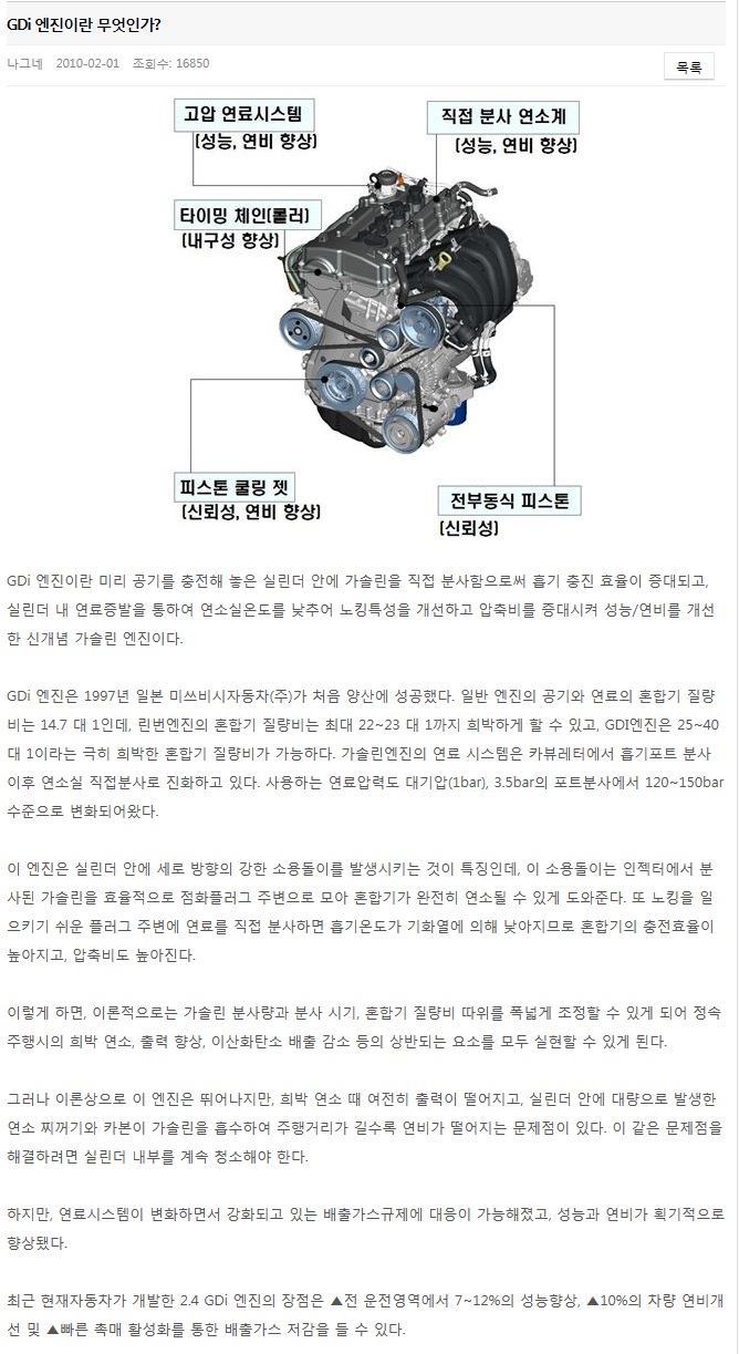 위의 포스팅 내용은, 정확한 정보제공 차... GDI 엔진의 구성과 역사는 NAER 자료실에서 출처 하였고..