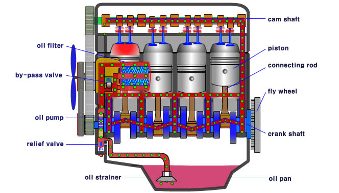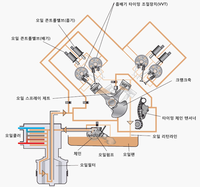유압 라인(혈관)이라는 관로를 타고.. 각 부품의 유압장치 및 윤활장치의 작동을 돕고.. 엔진 내부의 윤활작용을 하는 동시에 엔진 내부의 청정 작용 또한 맡고 있는데..