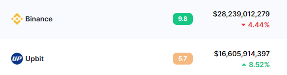 한국 거래소 업비트가 거래량 2위를 달리고 있습니다.