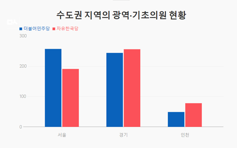 격전지인 만큼 현재 서울과 경기, 인천의 지방의회에서는 자유한국당과 민주당이 비슷한 수준으로 의석을 차지하고 있다. 다만 자유한국당이 조금 더 많은 의석 수를 차지하고 있는 것으로 확인됐다.