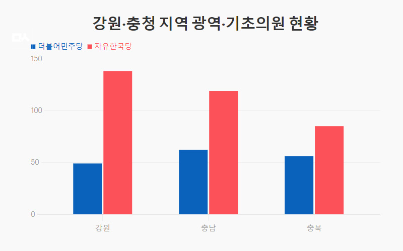 역대 선거에서 보수 성향이 강했던 강원·충청 지역의 경우는 어떨까. 강원의 경우 민주당 소속인 최문순 강원도지사가 자리를 굳건히 지키고 있지만, 기초단체장을 비롯해 광역·기초 의원 중 자유한국당 소속의 비율이 압도적으로 높다. 충청에서도 자유한국당의 강세가 두드러지게 나타났다.