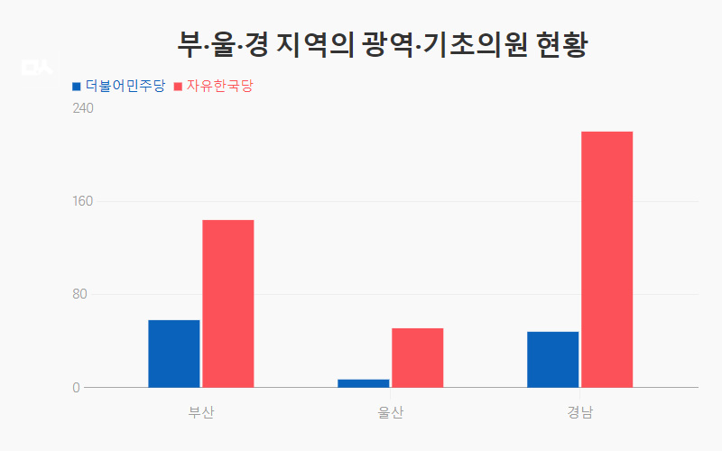 경남의 경우에는 18명의 시장 가운데 자유한국당이 13명을 차지하고 있고, 민주당은 3명뿐이다. 도의원은 총 55명인데, 자유한국당이 48명으로 대다수를 차지하고 있고, 민주당은 3명이다. 시의원의 경우도 차이가 두드러진다. 시의원 251명 가운데 자유한국당은 172명인 반면, 민주당은 45명에 그쳤다.
