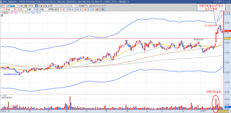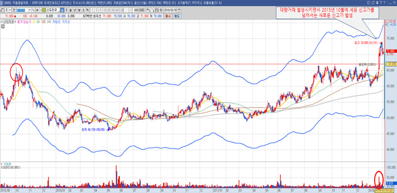 2015.10.02일에 세웠던 고점을 2017.09~2018.01까지 넘을락말락 하다가 드디어 2017.01.24 대량거래를 발생시키면서 새롭게 갱신을 했군요!