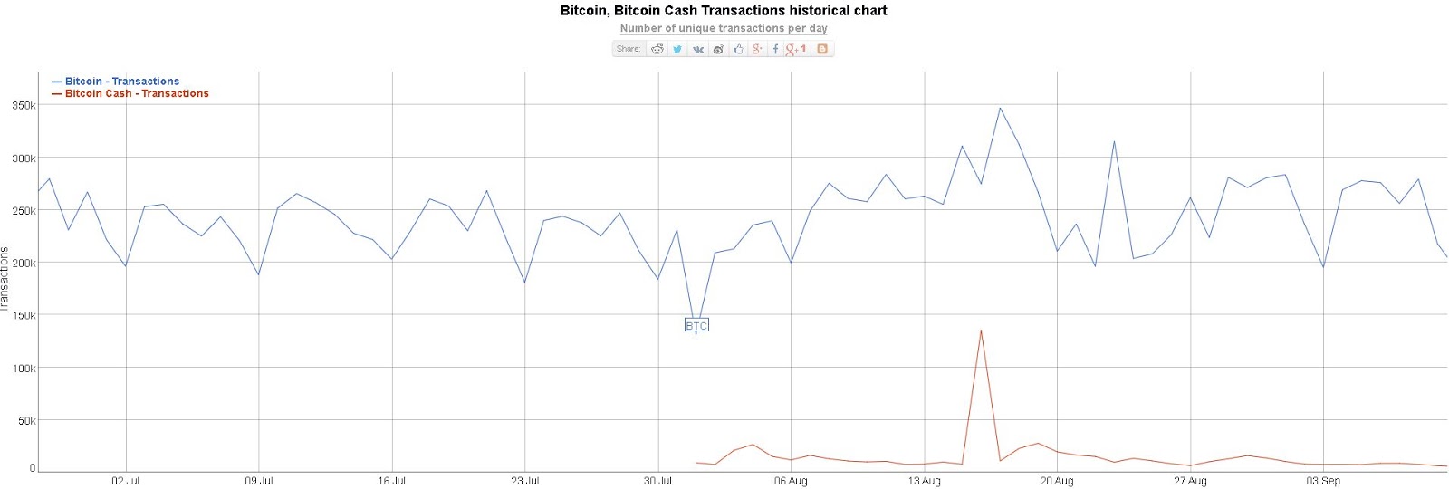 참고 : 비트코인캐시의 일간전송량. 비트코인이 8년에 걸쳐서 30만건을 쌓아온데 반해 단 보름만에 13만건의 전송에 도달.
