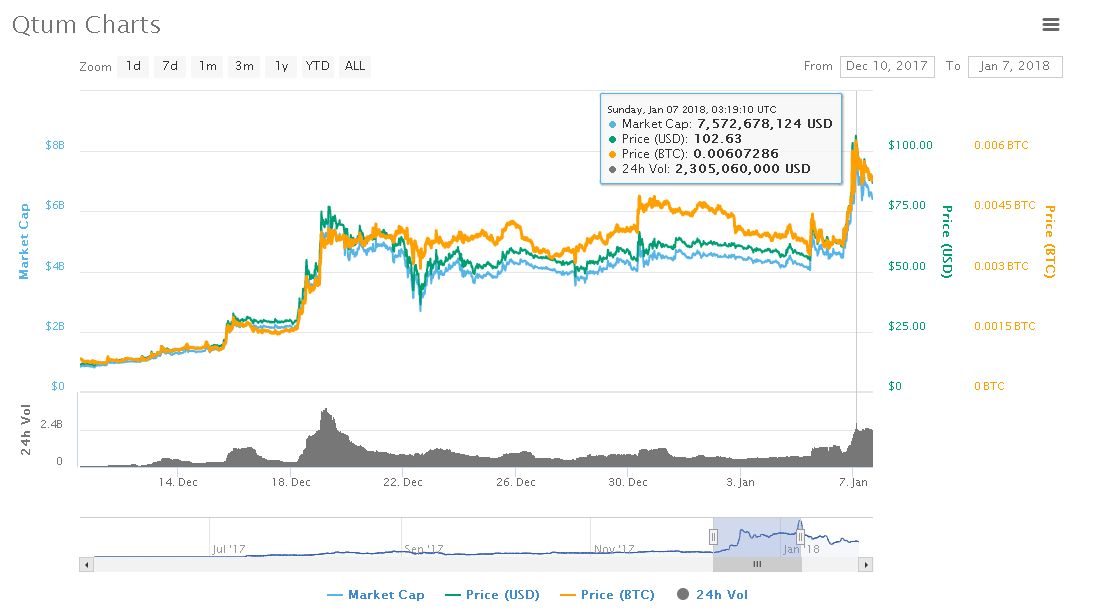 참고 : Qtum의 전송량 추이, 12월 19일 고점이후, 2018년 1월 5일 최고점 도달