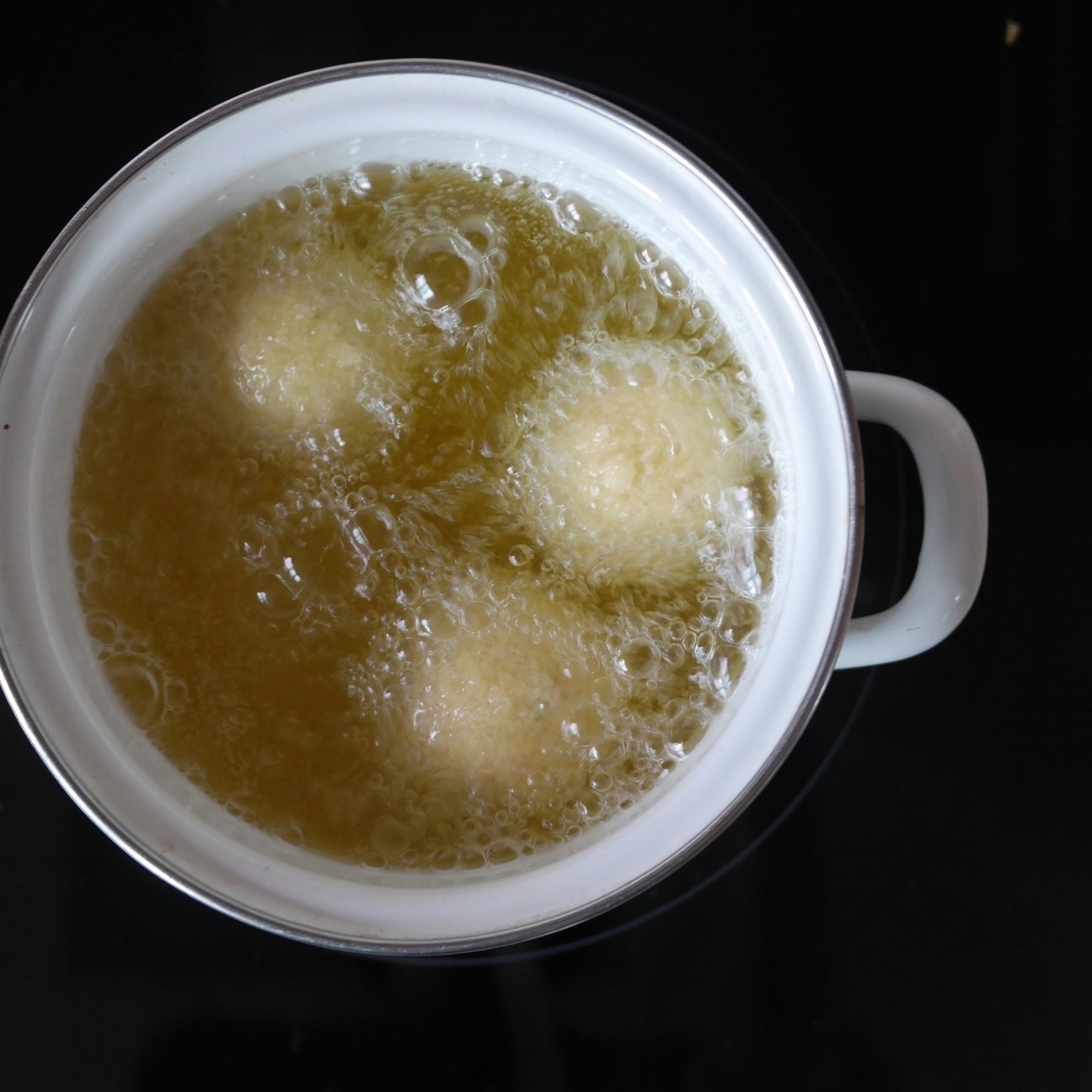 냄비에 반죽이 잠길 정도로 카놀라유를 붓고 기름 온도를 170도로 올려주세요. 중불로 줄인 후 크로켓을 튀겨주세요.