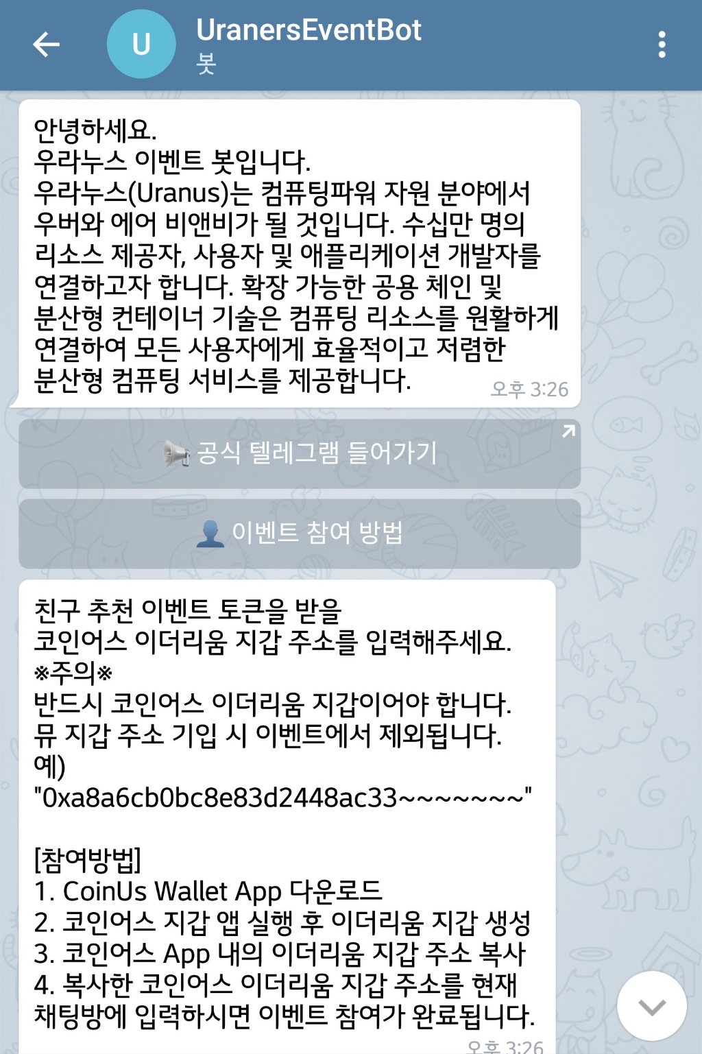 2.이벤트 참여방법 클릭하여 코인어스 지갑 다운받은후 코인어스 지갑내 이더리움 주소 복사 채팅창에 입력