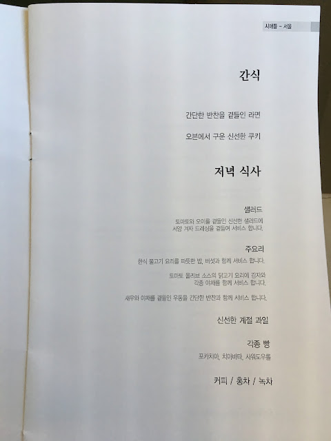 그리고 와인을 이코노미석에서는 작은 병에 담긴 와인을 플라스틱 컵과 함께 줬던 걸로 기억하는데, 비즈니스석에서는 와인병을 가져와서 골라마실 수 있다. 그밖에 칵테일이나 위스키 브랜디 등의 주류도 준다. 잠시 뒤에 두 끼 식사 메뉴를 물어보는데, 난 그냥 둘 다 한식.