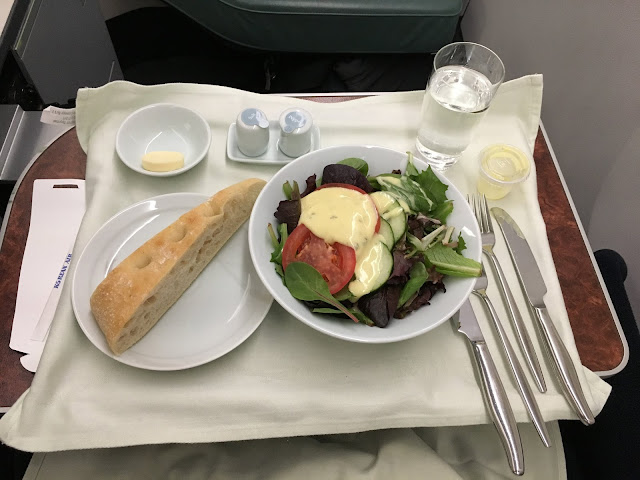 라면 먹고 자면 얼굴 붓는다는데, 정말 부었다(...) 그래도 편하게 네 시간 정도 푹 자고 나서 착륙 두어 시간 전에 불 켜고 깨워서 밥준다. 아래 사진은 애피타이저로 주는 빵이랑 샐러드. 메인디쉬로 불고기밥이 왔는데 바로 쳐묵쳐묵하느라 깜빡하고 사진은 안찍었다.