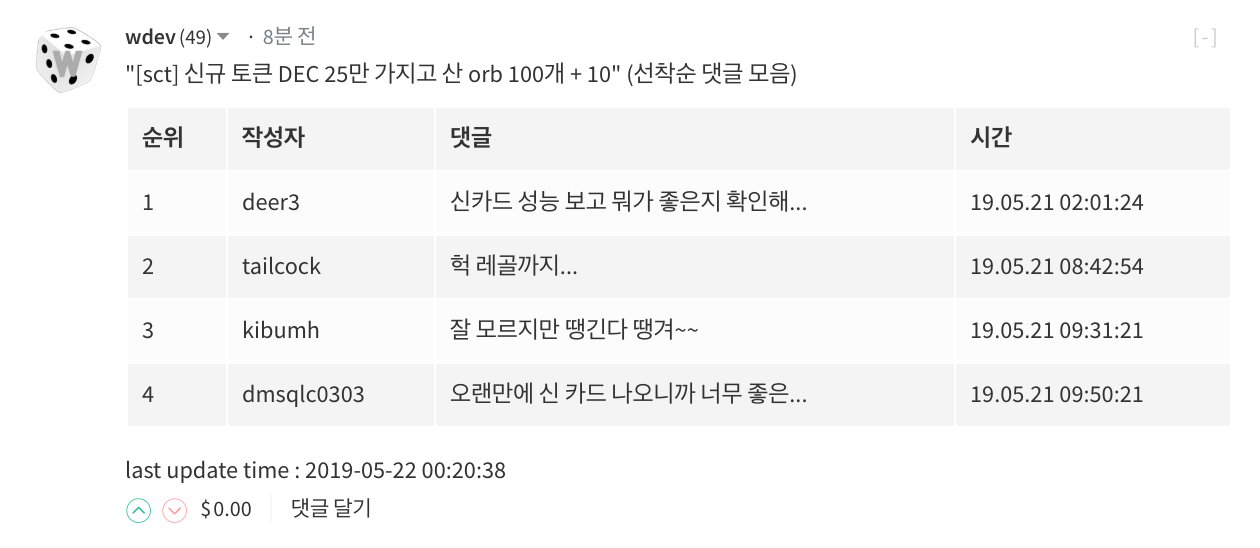 - 한 30~1 분 이내에 댓글 순위를 발표하여 wdev 계정으로 댓글 랭킹을 작성해 줍니다. (대댓글이 많으면 속도가 좀 느려짐)