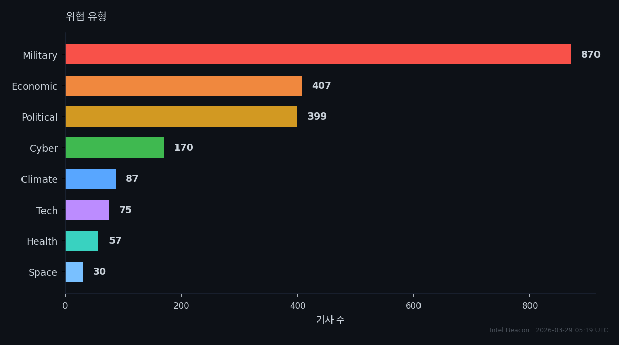 우세한 위협 범주인 군사, 경제, 정치 부문은 글로벌 안정성에 대한 지속적인 압력을 시사한다.