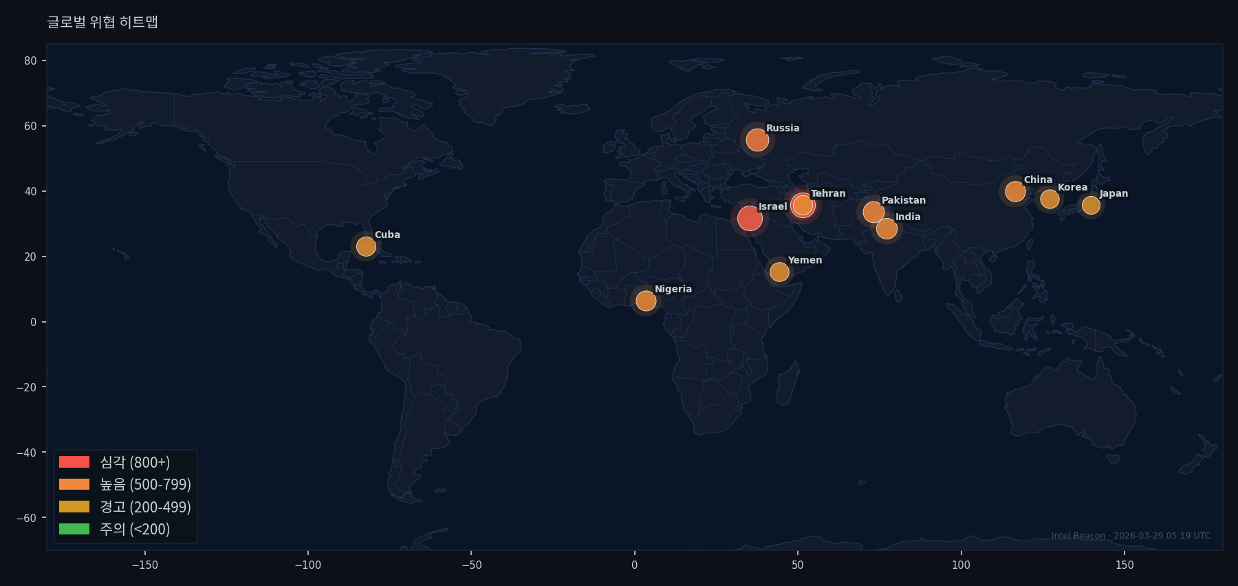 글로벌 안보 환경은 심각 단계에 있다. 여러 고심각도 사건이 지역 전반에 걸쳐 수렴하고 있다. 모든 모니터링 대상 부문에서 경계 강화를 권고한다.