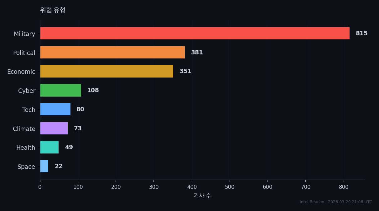 우세한 위협 범주(군사, 정치, 경제)는 글로벌 안정성에 대한 지속적 압력을 시사합니다.