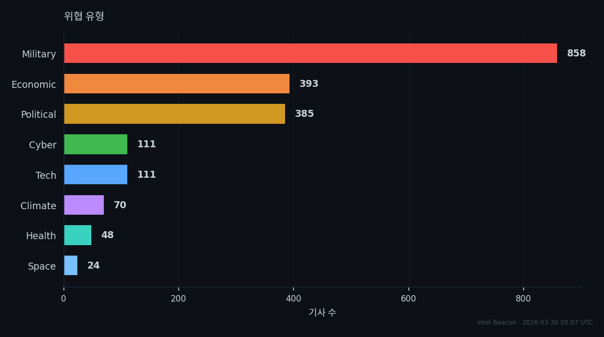 우세한 위협 범주인 군사, 경제, 정치는 글로벌 안정성에 대한 지속적 압력을 시사합니다.