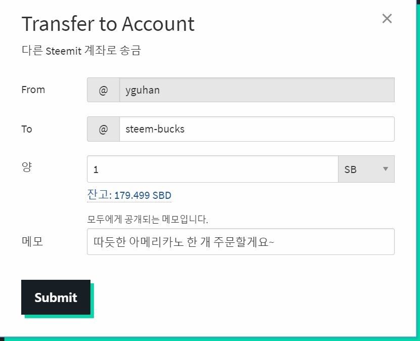 스팀벅스 토큰(SB)을 한 개 전송하여 아메리카노를 주문!
