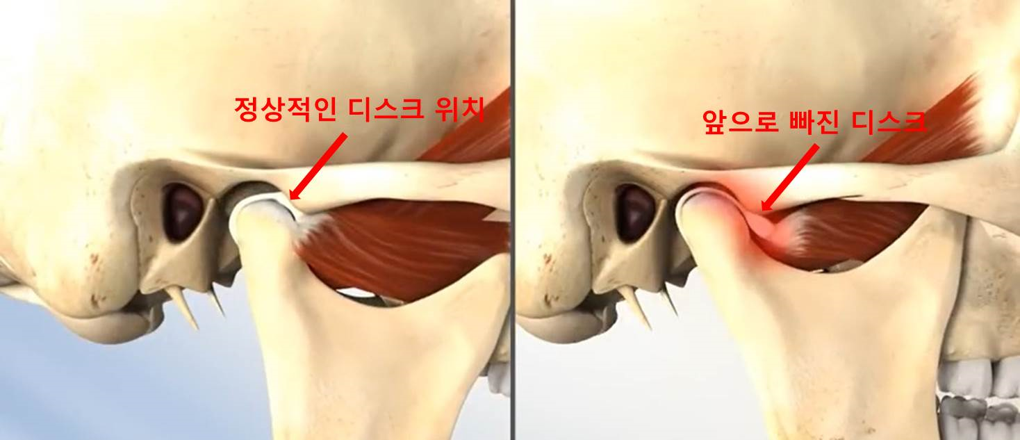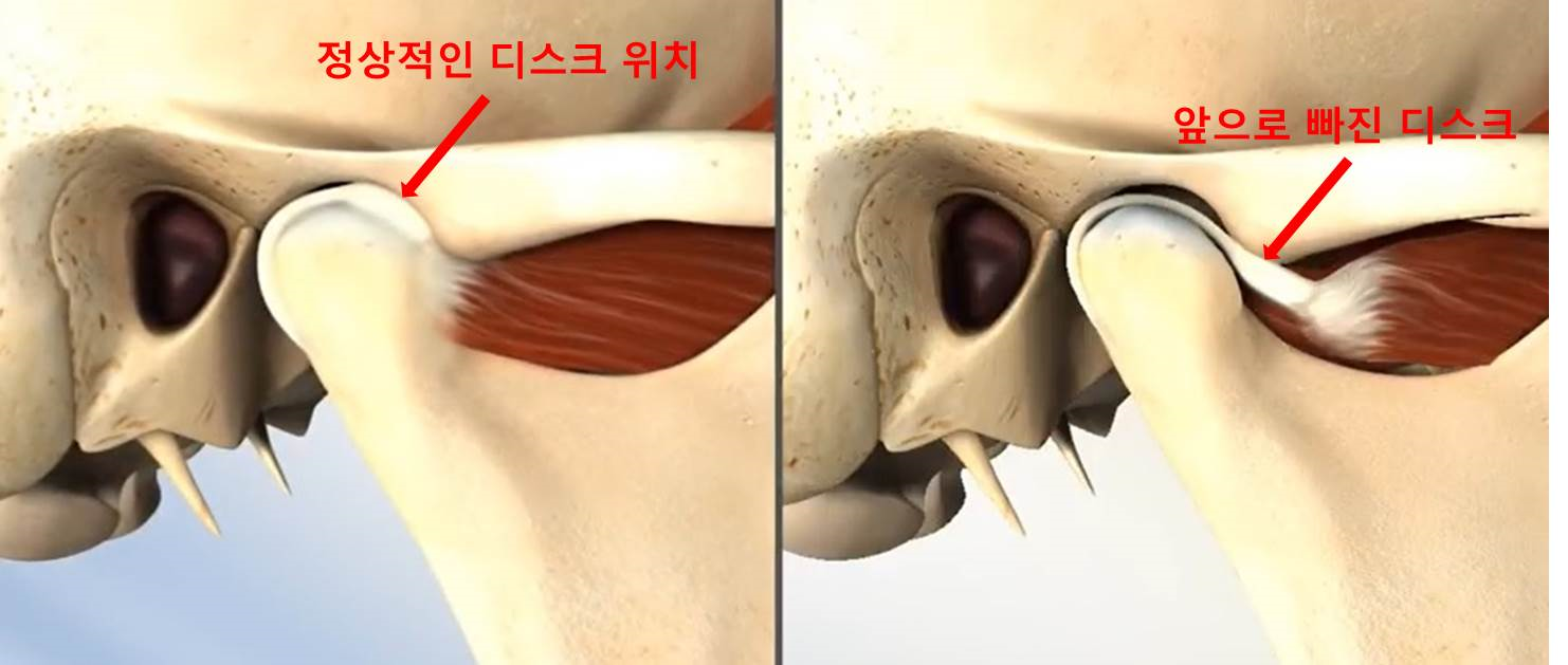 입을 벌릴 때 하악과두가 앞으로 미끄러지면, 앞에 위치하고 있던 디스크와 다시 만나게 되면서 과속방지턱을 넘는 것처럼 ‘덜커덩’합니다. 보통 주관적으로 느끼기에 ‘딱’하는 소리가 나지요.