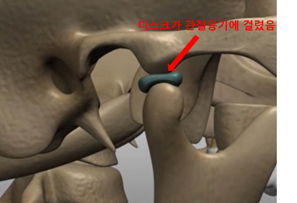 입이 안 벌어지는 경우는, 디스크가 앞에 빠져있는 상태에서 하악과두가 앞으로 가야하는데 디스크가 앞에서 막고 있으니 활주운동(Sliding movement)을 못하니 발생하게 되는 겁니다.