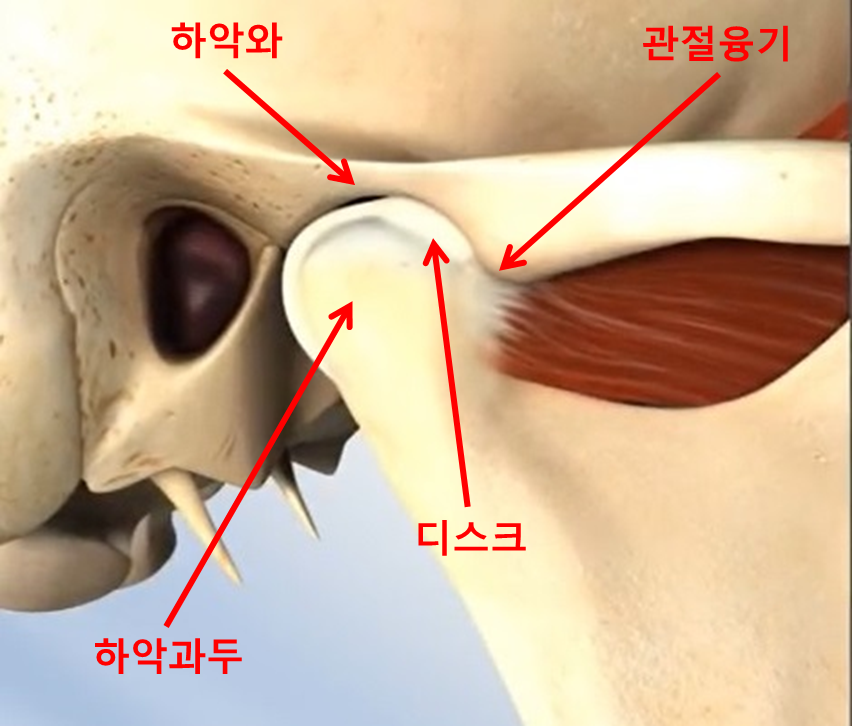턱관절을 구성하는 주요 구조물로는 아래턱뼈의 하악과두, 관자뼈(측두골)의 하악와, 관절돌기, 디스크, 디스크를 잡고 있는 후방인대 정도 보시면 되겠습니다.