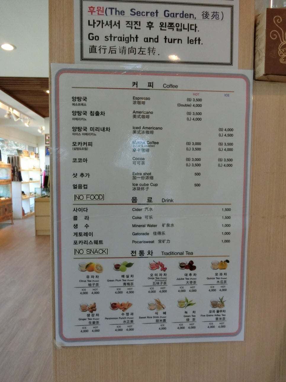 입구에서는 보이지 않는 카페 메뉴와 계산대. 음료는 전통 한방차와 커피 음료를 팔아요.