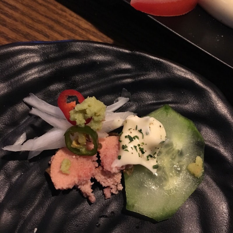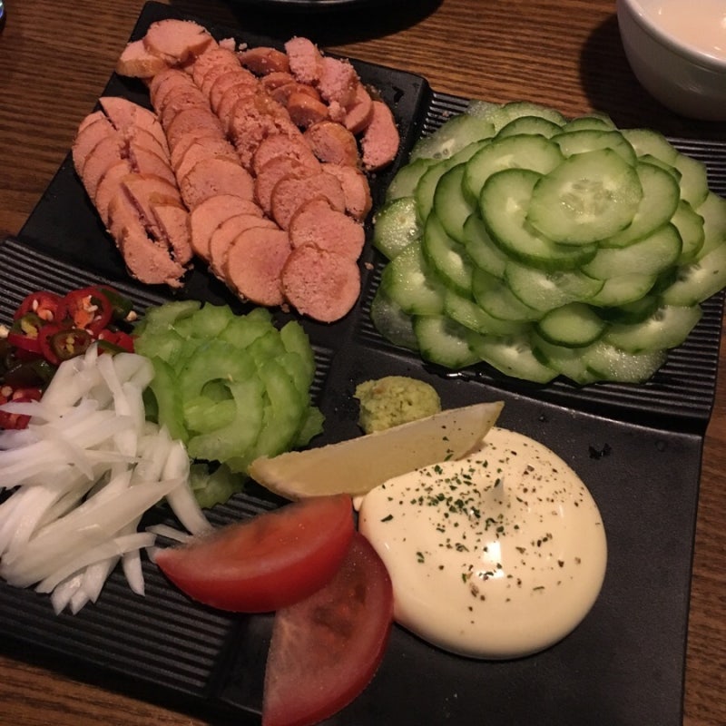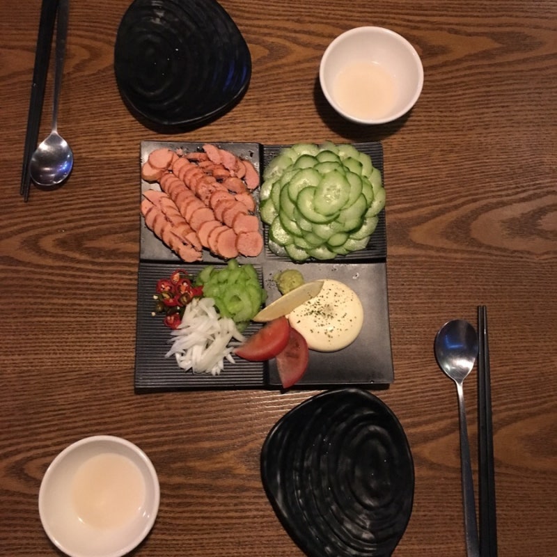얇게 슬라이스된 오이, 고추,양파를 조금올리고 마요네즈로 찍어먹어 봤구요.
