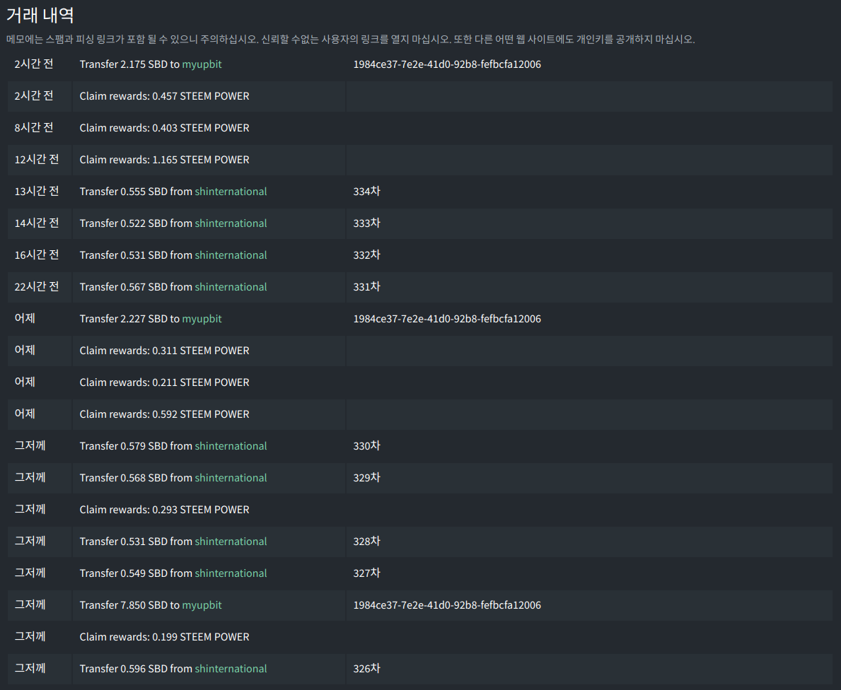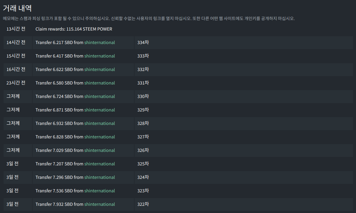 뭔가 익숙한 아이디로부터 지속적으로 이체가 이루어지고 있는데, 알고보니 저도 예전에 한번 아무생각 없이 참여한 적이 있었던, 기여도 대비 보상을 지급하는 리워드 풀 같은 것이었습니다. shinternational이라는 계정의 대부분의 글은 저자 보상 스팀달러를 나눠준다는 글이며, 3시간씩 글이 올라오니 하루에 8번 정도 글이 올라옵니다. 거의 비슷한 시간에 맞춰서 올라오는 걸 보면 아마 봇으로 운영되지 않을까 추측됩니다.