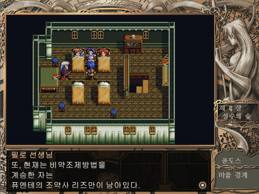 필로 선생 : 엇, 있다! 여기다. 에ㅡ그러니까, 뭐뭐. 회복마법이 통하지 않는 주문이 걸려 있을 경우... 라. 통상의 주문해독이 통하지 않을 정도로 강력한 주문이 걸려 있는 경우, 특제의 비약을 써서 해소해야 한다. 또 현재 비약의 조합방법을 다룰 줄 아는 사람은 퓨엔테국의 조약사 리즈뿐이라고 되어 있어.