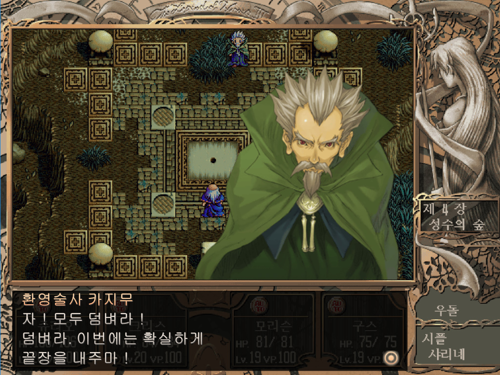 환술사 카지무 : 아직도 살아있을 줄이야. 직접 확인을 해보니, 꽤 실력이 있는 것 같군... 자 4명이 공격해도 좋다. 모두 덤벼라! 이번에는 확실하게 목숨을 끊어 줄테니.