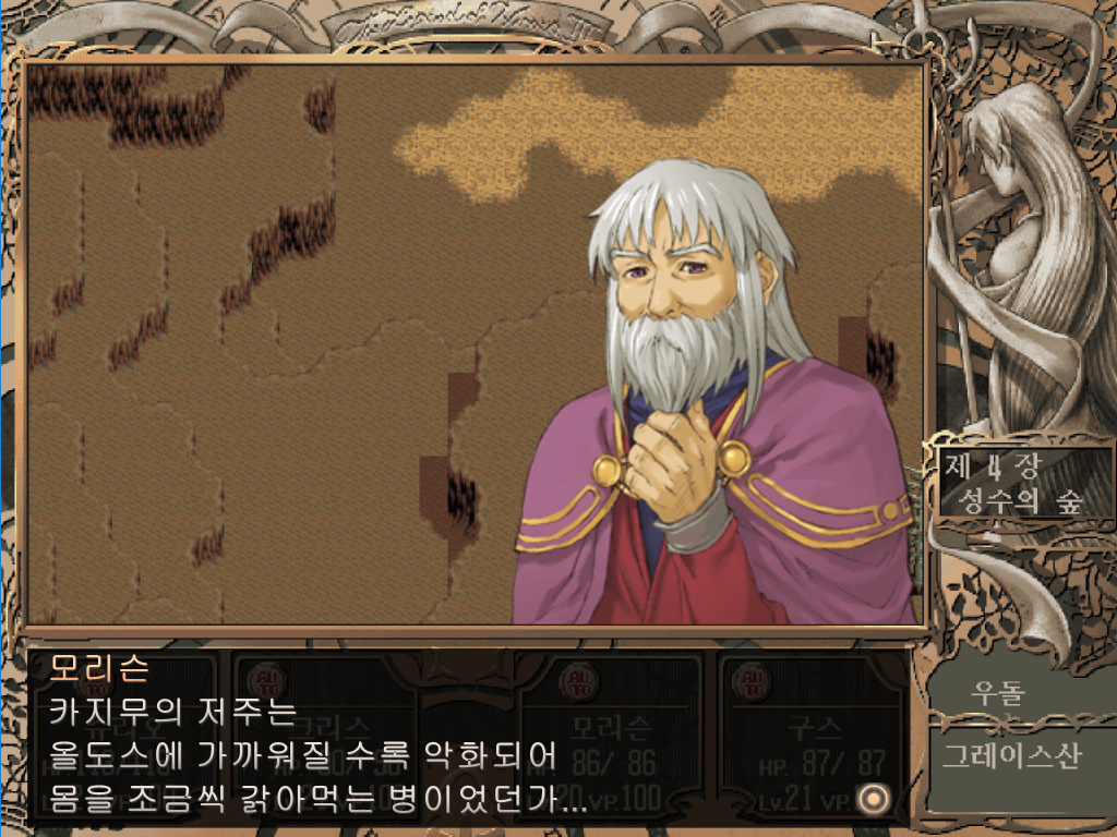 시플의 현자 : 이번에는 정말로 신세를 지게 되었군요. 올도스로 향하는 것이지요? 앞으로 조금 남았습니다. 조금만 힘내시면 됩니다. 조심해서 여행을 계속해 주십시오. 여러분의 여행이 많은 결실을 맺기를 마음속으로부터 기원하고 있겠습니다.