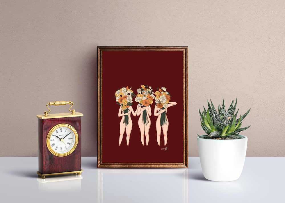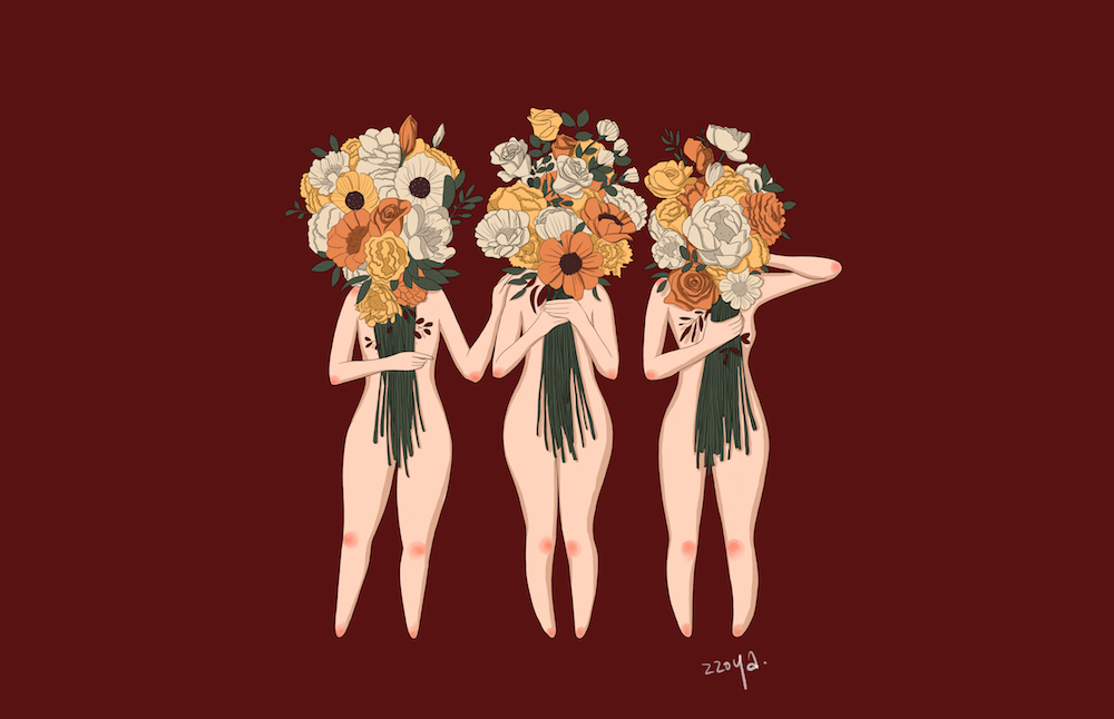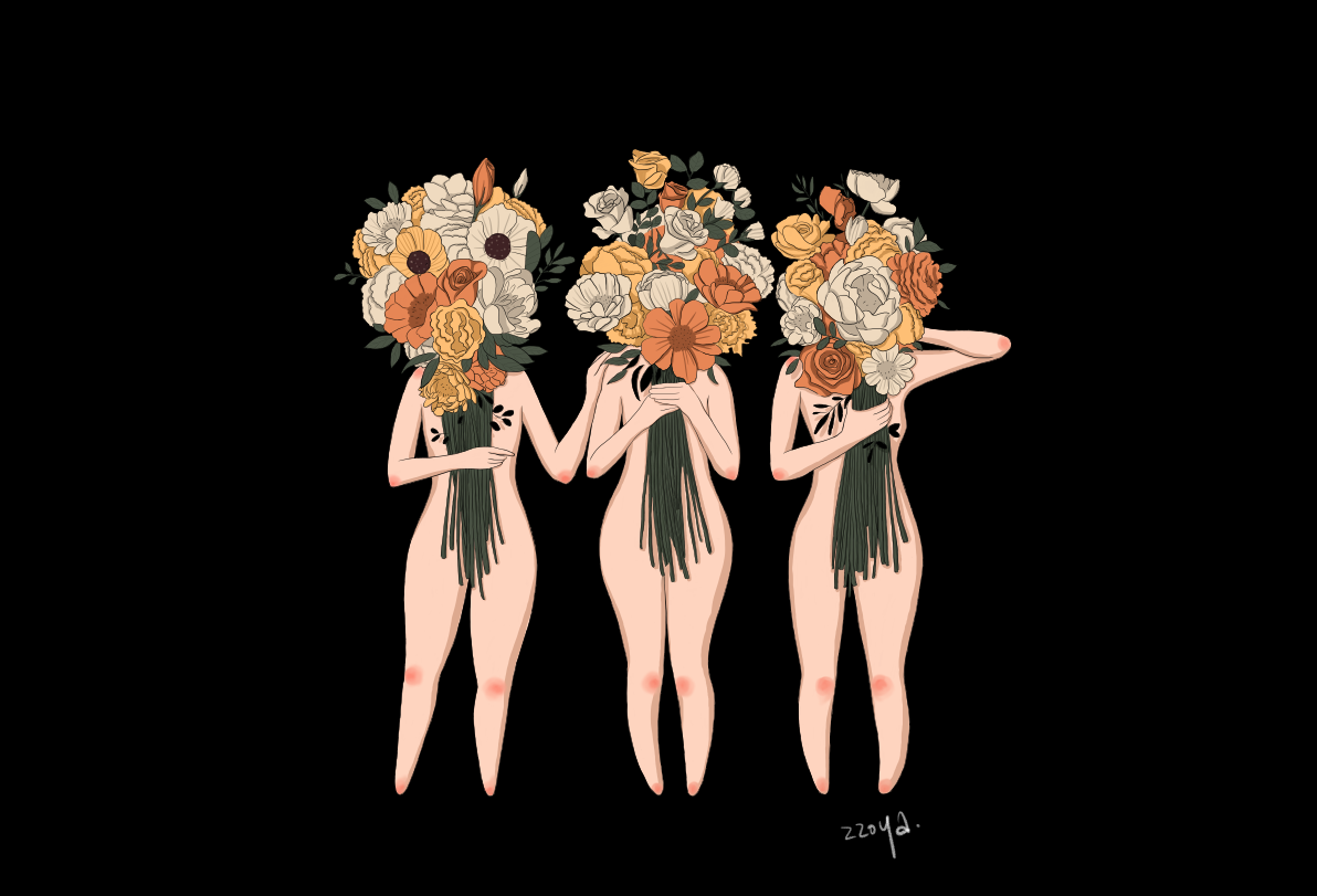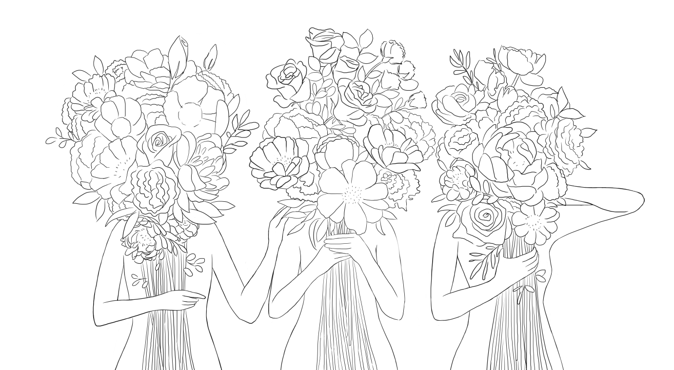 간단히 그림 설명을 하자면, 사람들은 저마다 한 가득 자신의 꽃다발을 보여주고 있지만 그 속에 들어있는 감정은 화사하지만은 않은 것 같아요. 어디까지가 진실인지 얼마나 고통받고 있는지 꽃에 가려져 타인에겐 전달되지 않는 모습을 표현해 봤습니다.