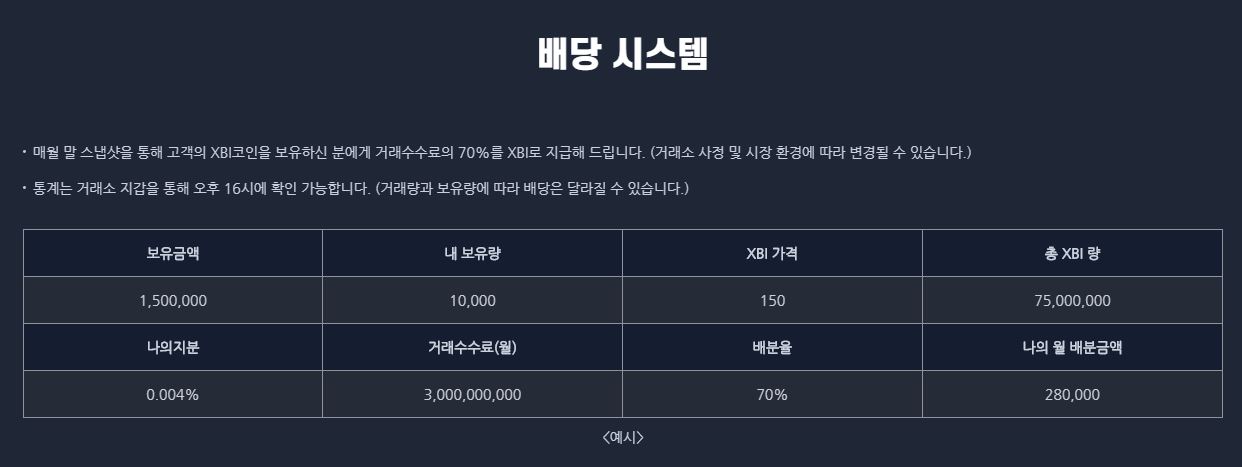 XBI 코인은 FX 및 암호화폐를 포함한 트레이드 매개를 주목적으로 하는 거래 매개 코인입니다. BI.Q 옵션 거래소에서의 이용이 우선하겠지만 그 외의 다수 거래소들과의 동반 성장을 목표로 설정했네요. 총 7,500만 개를 발행하는데 마이닝 채굴 방식이 아니므로 토큰의 가치는 시간이 갈수록 높아질 수 있습니다. 희소가치에 따른 가치 상승을 예견할 수 있죠.코인 상장 후 보너스 물량 락업 계획을 가지고 있으니 참고하세요. 요즘 국내 주식 시장에서는 우선주가 인기를 끌고 있는데요. XBI 코인의 수익 배당 시스템도 인상적입니다. 매월 말 코인 보유자를 대상으로 거래수수료의 일정 비율을 지급한다는 계획도 확인할 수 있습니다.