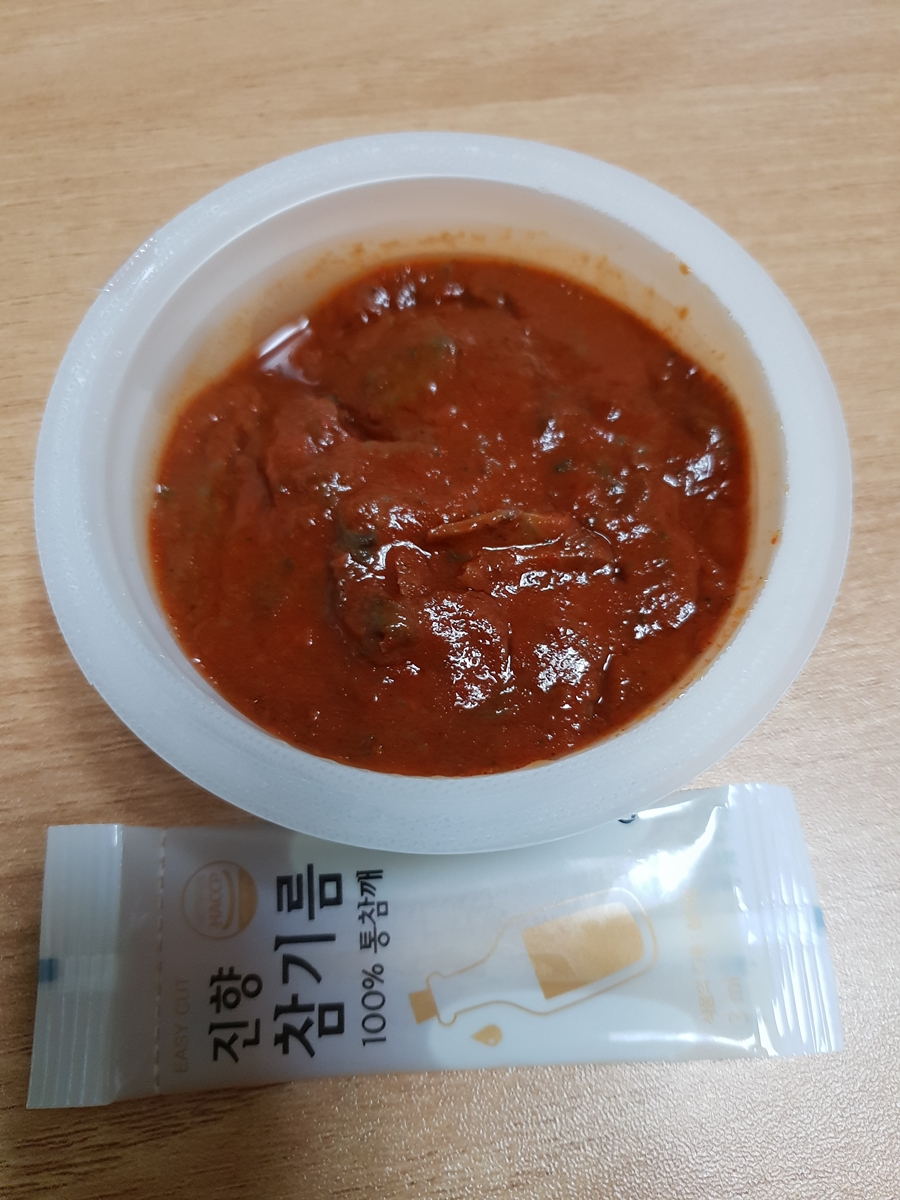 매운향이 확 퍼지는 꼬막장과 참기름의 구성입니다
