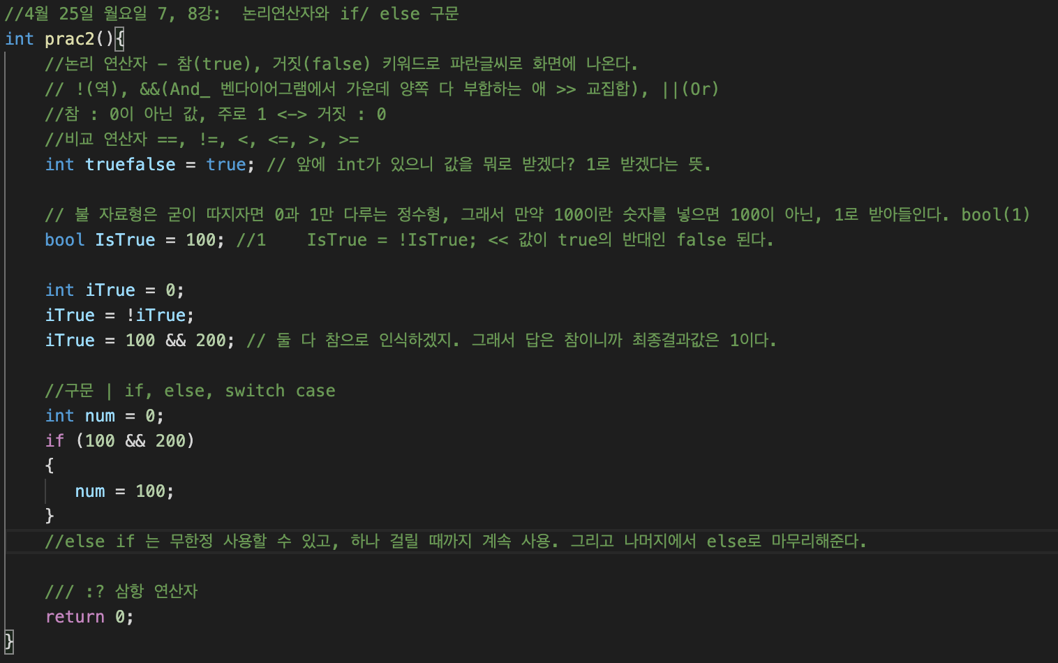 bool IsTrue = 100; //1 IsTrue = !IsTrue; << 값이 true의 반대인 false 된다.