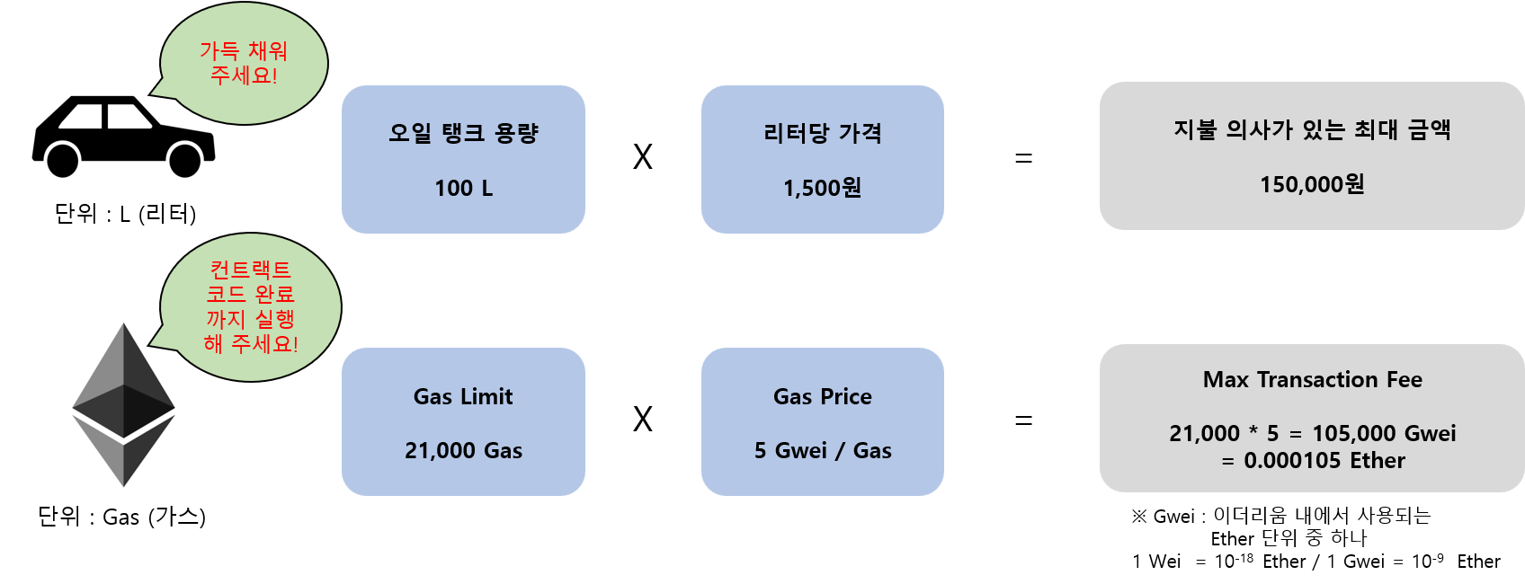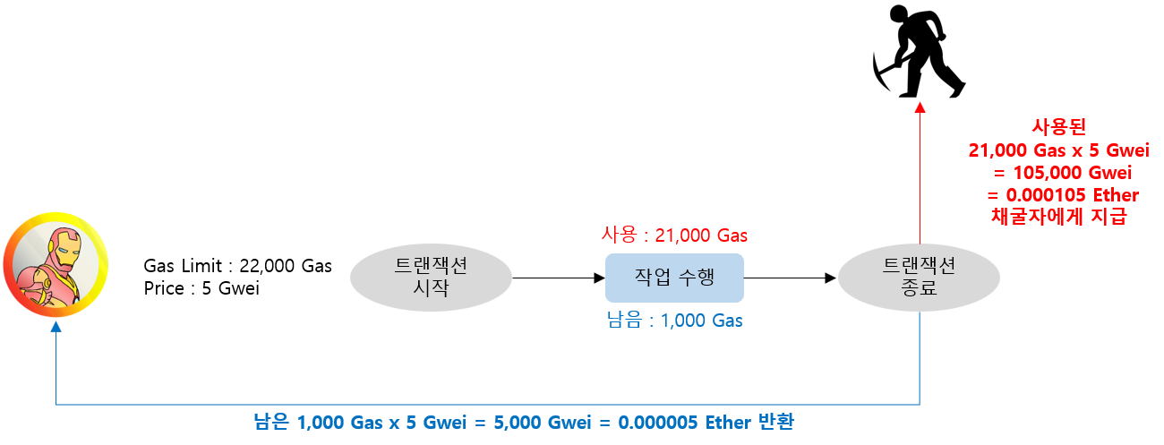- GasLimit : 트랜잭션 수행에 소비될 총 가스 예상량 (무한 루프 방지)