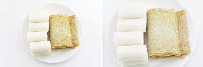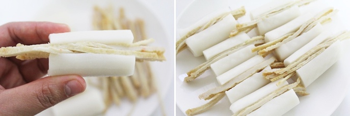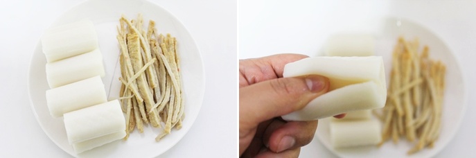칼집을 낸 가래떡 사이에 어묵채를 넣어서 준비 해 주세요.