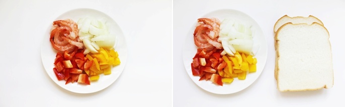 식빵(2개),칵테일새우(한 줌),양파,파프리카,칠리소스(1스푼),케찹(1스푼),깨,마요네즈