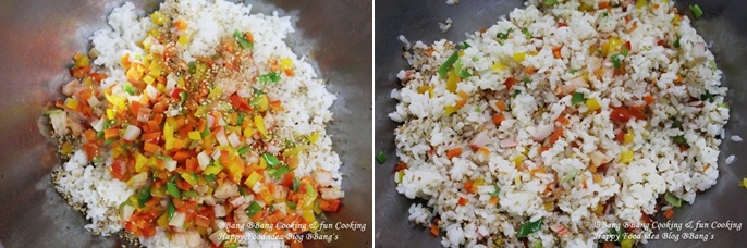 밥 위에 볶은 야채와 깨,소금,참기름,식초를 넣고 버무려 주세요.