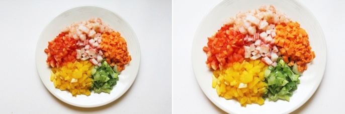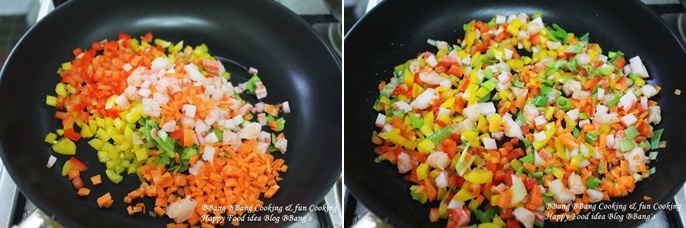 먼저 파,맛살,새우,파프리카,당근등 야채를 사진처럼 잘게 썰어서 준비해주세요.