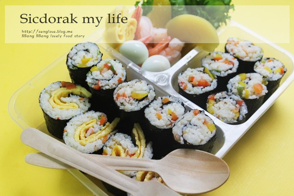 칵테일새우,파프리카,당근,맛살,파,참기름,식초,밥,김(3~4장),계란(2개),소금,