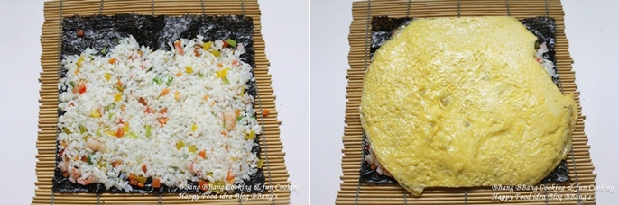 김 위에 버무려준 밥을 올려서 계란지단과 함께 말아주세요.계란지단은 생략하셔도 됩니다.